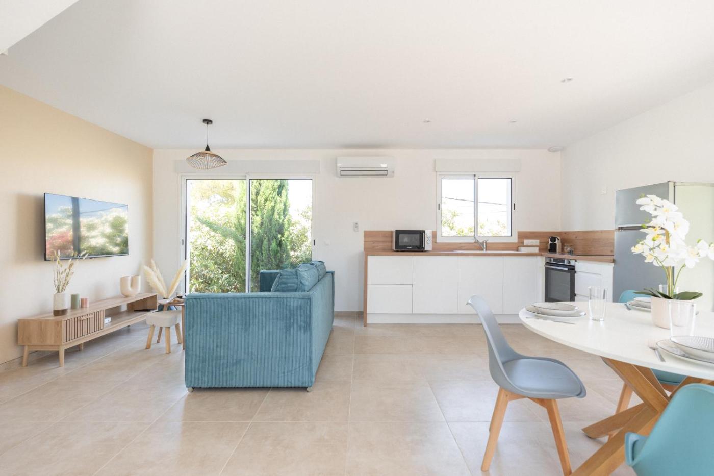The villa with a terrace and garden views features 2 bedrooms, a living room, a flat-screen TV, an equipped kitchen with a dishwasher and an oven, and 1 bathroom with an a bath or shower. Towels and bed linen are provided in the villa. For added privacy, the accommodation has a private entrance and soundproofing.